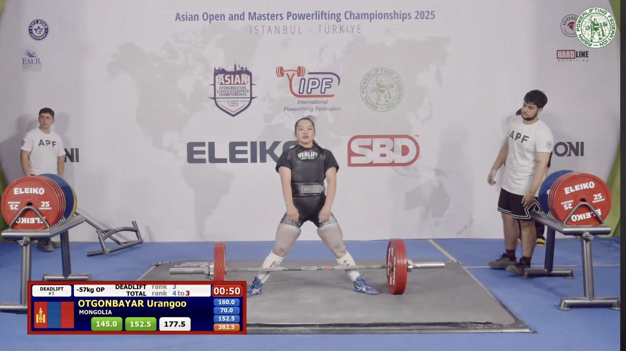 Монголын Пауэрлифтингийн Нэгдсэн Холбоо (МПНХ)-ны “Стронг” клубийн тамирчин, спортын мастер О.Урангоо эмэгтэйчүүдийн 57 кг-ын жинд өрсөлдсөн. Тэрээр: Таталтын төрөлд хүрэл медаль хүртсэн байна.